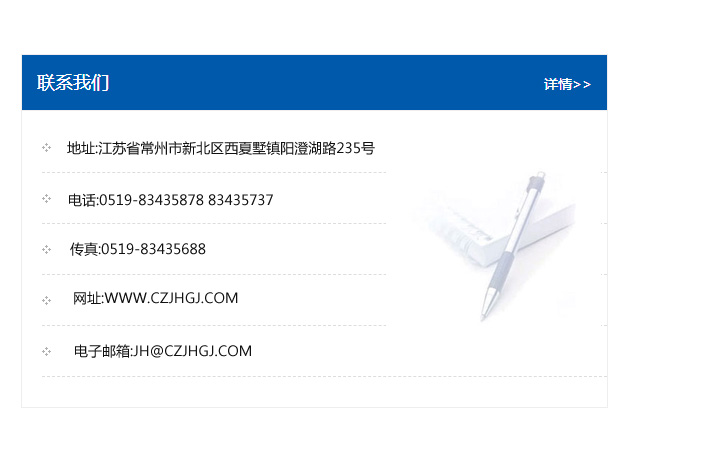傳真:0519-83435688    郵編:213135    網址:WWW.czjhgj_com.aiwacun.com    電子郵箱:JH@czjhgj_com.aiwacun.com